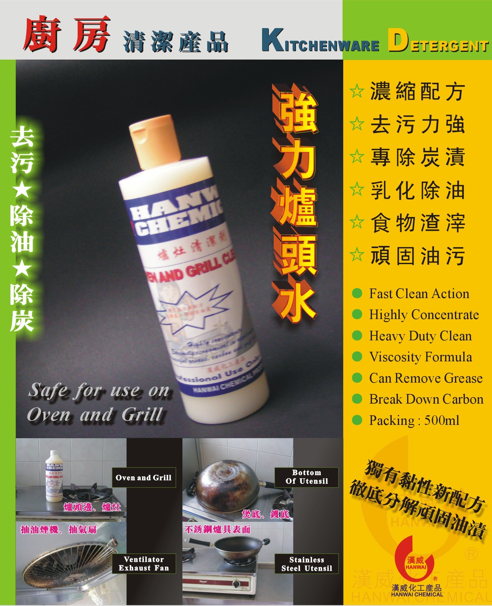 放大獨有黏性新配方,去污力特強,專洗頑固抽油煙機、爐頭邊、煲底、鑊底、不銹鋼爐具表面之難洗油污、燒炭漬、食物渣滓等。