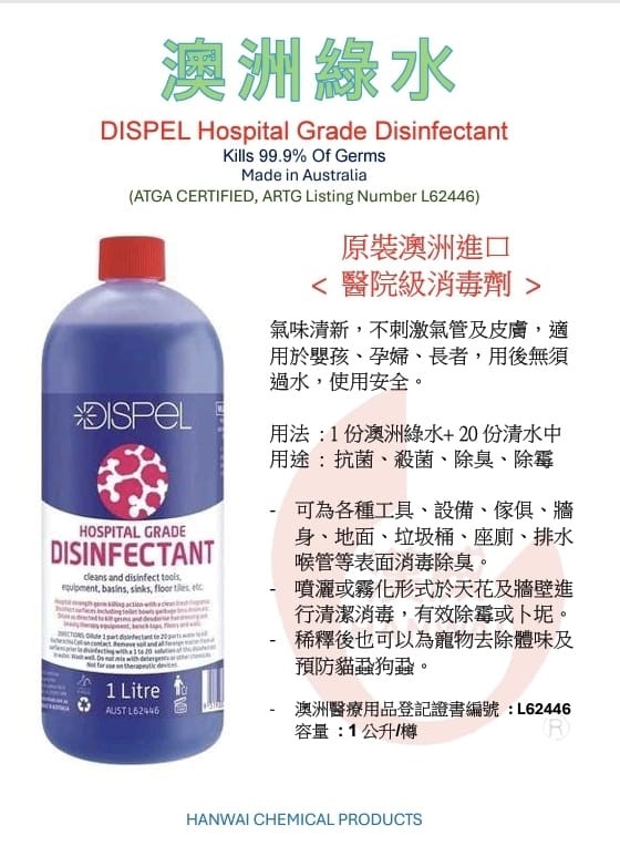放大原裝澳洲進口,澳洲製造,醫院級消毒劑,具備殺菌除臭除霉三合一功效,氣味清新,使用安全,不刺激氣管及皮膚,適用於嬰孩、孕婦、長者,用後無須過水。