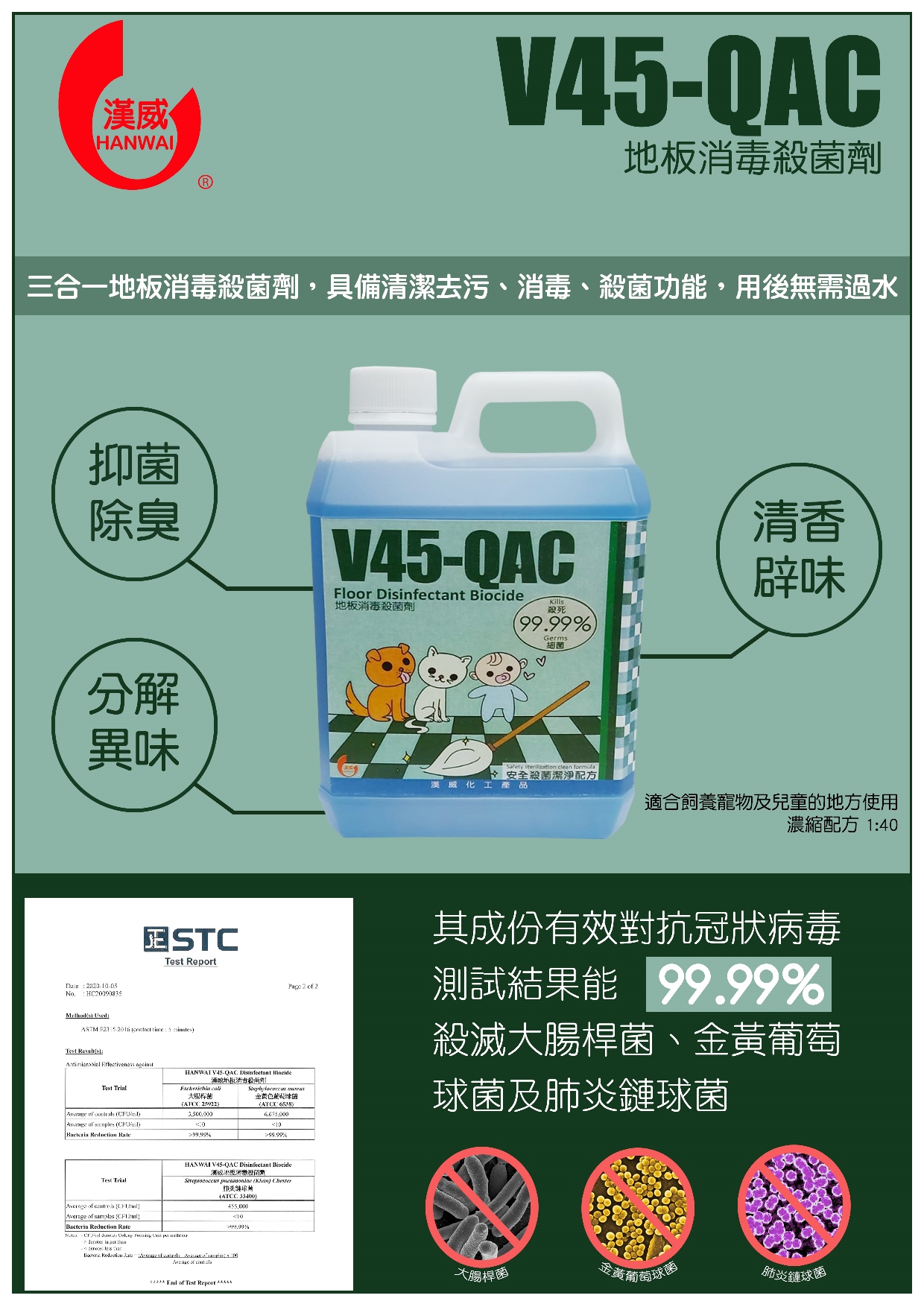 放大三合一地板消毒殺菌劑,具備清潔去污、消毒、殺菌功能,適合飼養寵物及兒童的地方使用,有效抑菌除臭、分解異味、清香辟味,其成份有效對抗冠狀病毒測試結果能99.99%殺滅大腸桿菌、金黃葡萄球菌及肺炎鏈球菌。