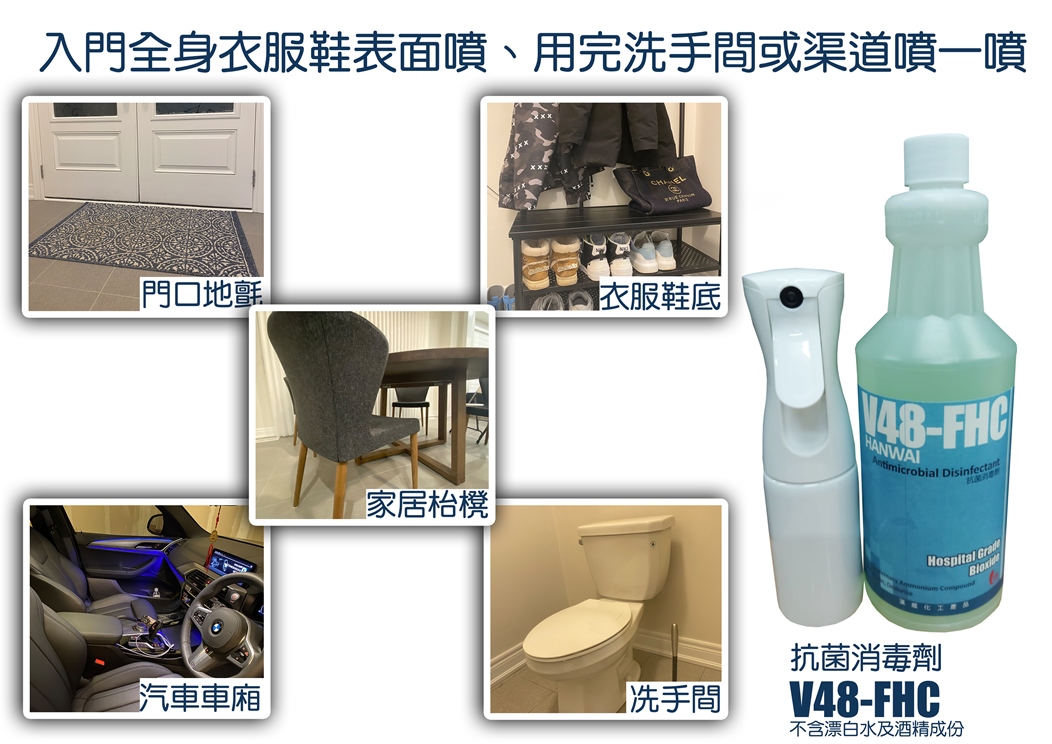 有效消毒門口地氈、汽車車廂、衣服鞋底、電腦鍵盤、手提電話、玻璃、扶手、洗手間內的座廁、廁板及洗手盆等表面,用後無需過水。