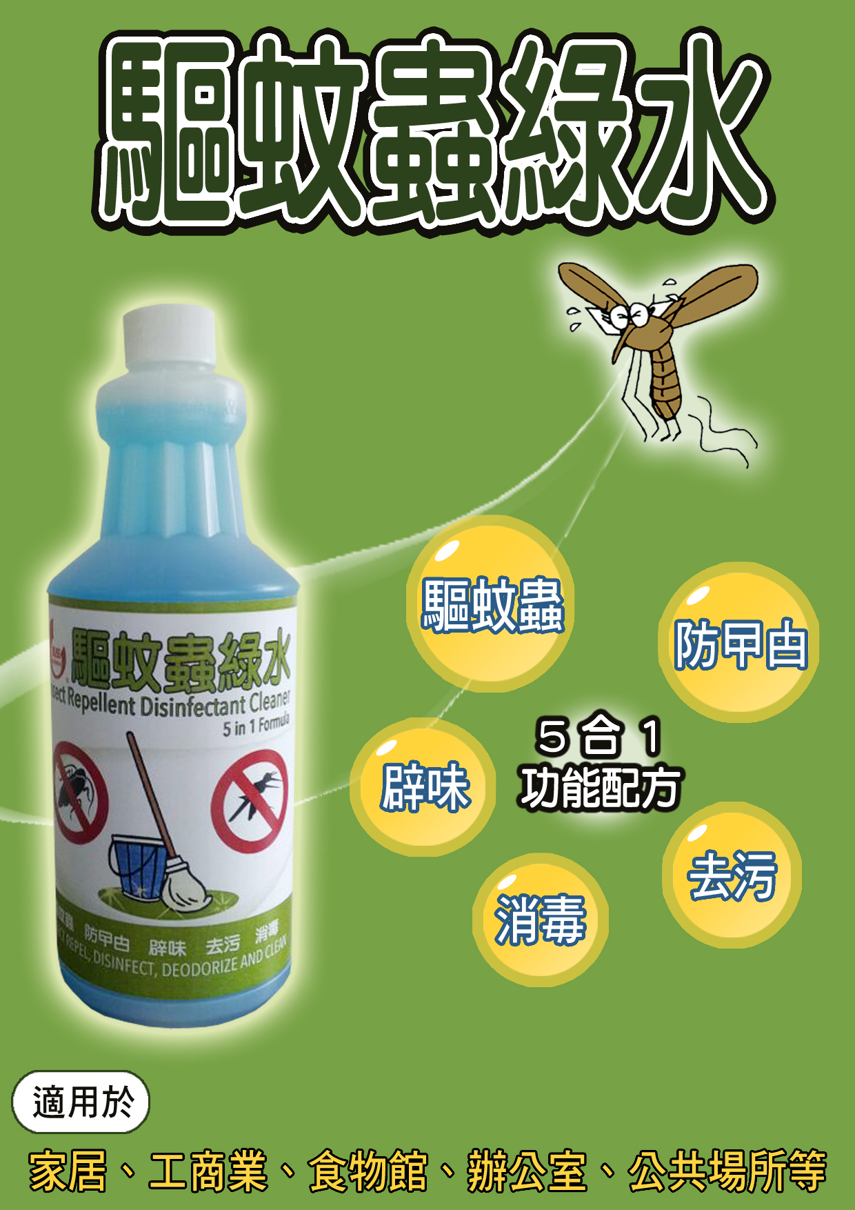 放大獨特清潔消毒5合1配方,具備除污、消毒、抗菌、辟味、除臭等功能,有效驅趕蚊蟲、蝨、甲甴等,適用於消毒及清潔室內外各種地板、地磚、牆壁、傢俬、門窗、浴缸、 防火膠板等驅蚊拖地消毒。